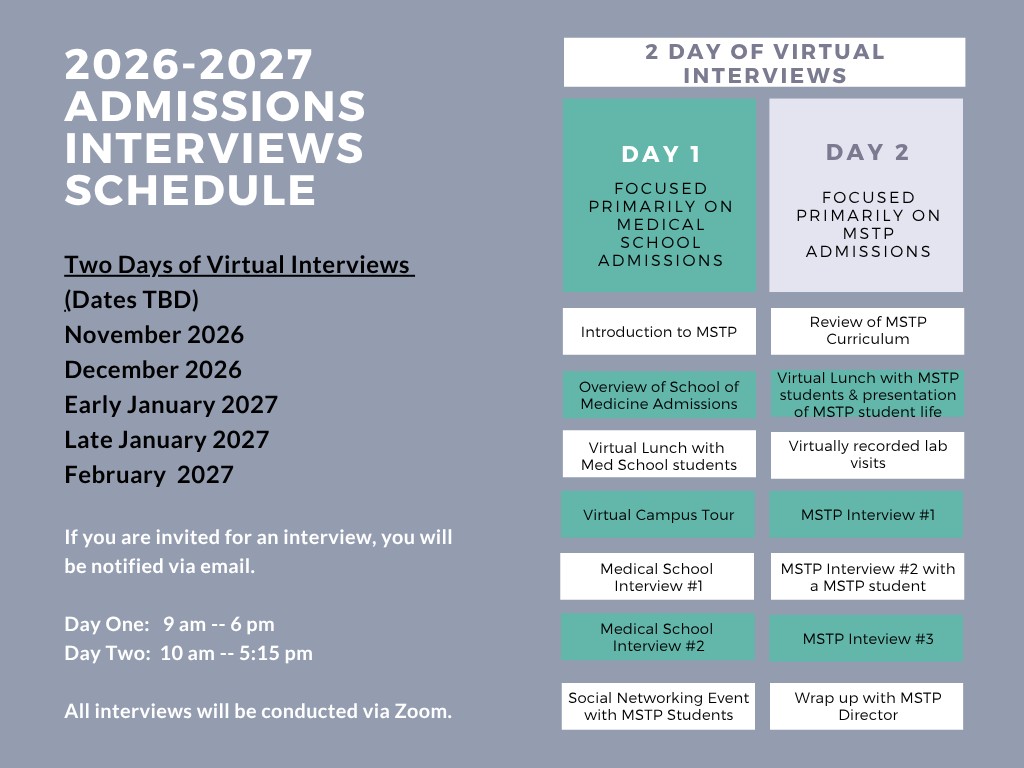After a series of interviews, the MSTP Admissions Committee, in conjunction with the Medical School Admissions Committee, meet to determine the acceptance of each candidate. MSTP applicants that are not accepted or placed on hold for the dual degree program are given consideration for the MD only program.