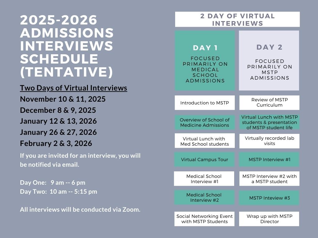 After a series of interviews, the MSTP Admissions Committee, in conjunction with the Medical School Admissions Committee, meet to determine the acceptance of each candidate. MSTP applicants that are not accepted or placed on hold for the dual degree program are given consideration for the MD only program.